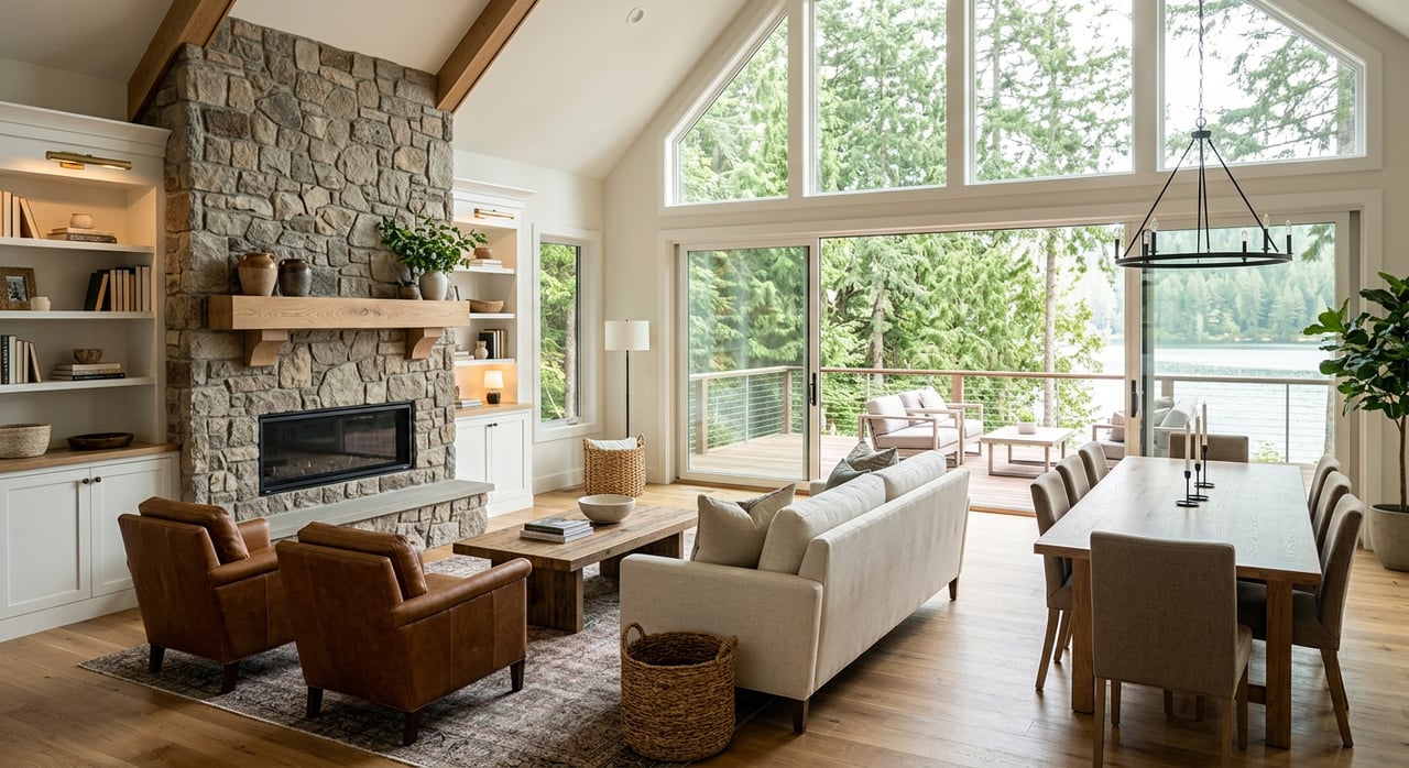 Open concept waterfront homes are popular because they offer a peaceful getaway while supporting a lively, interconnected lifestyle, making them ideal for family gatherings and fostering a sense of community.